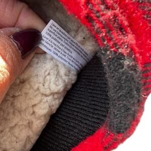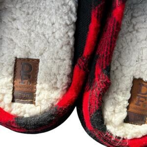 Dearfoams women’s size large 9–10 slippers. New condition. Red flannel plaid with black. 100% polyester. “MAMA BEAR” . Very padded. Hard plastic sole.