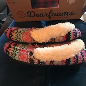 Girls knit Dearfoam slipper has a faux shearling sole and cuff, memory foam, is skid resistant and machine washable. Pink blue black purple knit Nordic Fair Isle print has a velvet iris bow. Never worn NIB giftable Comfy cozy warm house slipper.