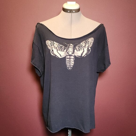 Black shirt with Death Moth print. Shirt has been intentionally distressed, cut, and mended to give it a more vintage distressed festival look. Hangs off shoulder, fits like an oversized size Medium - Large. Faded distressed fabric, raw edges, hand sewn in various spots to shape the style. Shirt was originally purchased from iconic Necromance shop in Los Angeles.