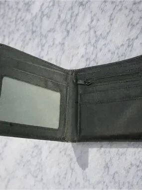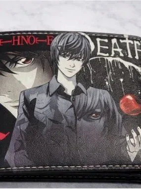 Black bi-fold wallet featuring bold Death Note artwork with detailed character design on the front. Made of durable faux leather with stitched edges., Card slots, ID window, zipper pocket, cash pocket, coin pouch. Kallie: *feels contractions