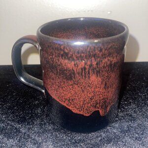 A professionally crafted ceramic mug designed for coffee enthusiasts who appreciate distinctive craftsmanship and bold branding. The mug features a striking rust-toned glaze that cascades dramatically over a dark base, creating a textured, artisanal appearance.