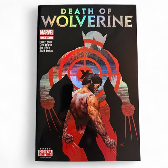 FEATURE: Death of Wolverine #1 (of 4) / Marvel Comics / 2014 / Holographic foil cover featuring Wolverine with target silhouette / Creators: Charles Soule, Steve McNiven, Jay Leisten, Justin Ponsor / Bonus: Includes Digital Edition code