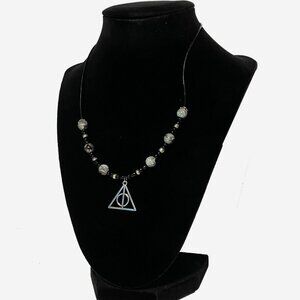 The symbol of the Deathly Hallows is surrounded by ink swirl beads as well as black and silver seed beads. The leather cord measures @ 17.5 inches and fastens with a barrel screw clasp. The Sign of the Deathly Hallows was used as a representation of the Deathly Hallows, three legendary objects that if united, would make one the "Master of Death." The sign is composed of three separate marks that make up the sign. The Elder Wand is represented by the straight vertical line, the Resurrection Stone by the circle surrounding it, and a triangle enclosing them both to represent the Cloak of Invisibility.