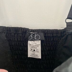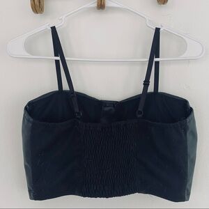 This black faux leather top features cups and adjustable spaghetti straps. It has an elastic back made from a jersey fabric which makes it fit perfectly. The top is in very good pre owned condition and is the perfect basic to wear with high waisted bottoms or under a chunky cardigan.