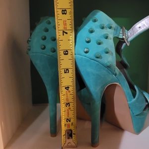 These are like new, may not have even been worn except to try on, can't quite remember. Super cute strappy heels by Deb in a pretty turquoise color. Featuring fun spikes on the back of the heel and a tall 5 3/4" heel height. Heels have a faux suede feel to them. Women's size 9.