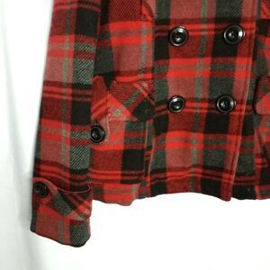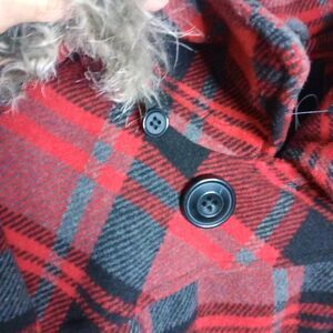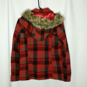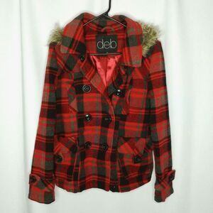 Deb Plaid Wool Blend Pea Coat Pockets Rmvable Fur Lined Hood Double Breasted Lrg