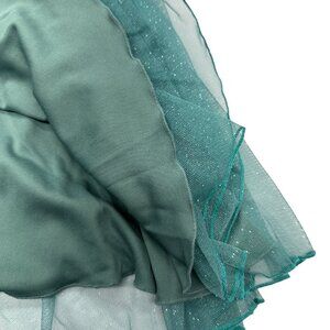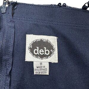This Deb fit and flare mini dress features a navy sequined bodice with lightly lined cups, a seafoam green skirt, slip liner, sheer glittered overlay, back zipper, and adjustable spaghetti straps.