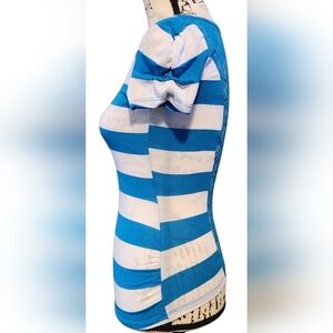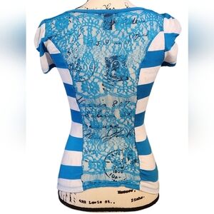 Striped Blouse with gorgeous lace back, slight ruching at hips and ruched sleeves. T-130