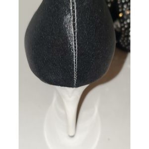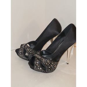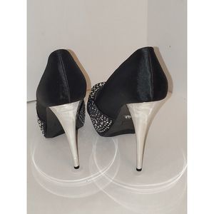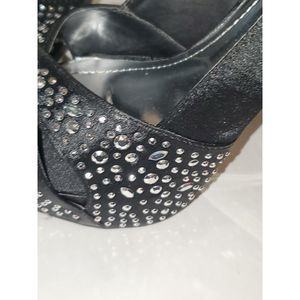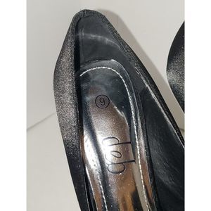 This is a very striking pair of Deb shoes in a women's size 9. They have rhinestone bling over the toe and silver heels. This is a runway or red carpet look. Imagine wearing these to your New Years Eve party. The inner sole is silver colored material and lightly padded with some scratches but they don't appear to be from wear. The outer sole is in very nice condition and has a slip resistant texture on the ball of the foot. These are an open toe with a criss cross upper. This is a platform shoe so the heel is actually 4". The material on the shoe feels like black satin. Overall these are in very nice pre-owned condition with very little signs of previous wear.
