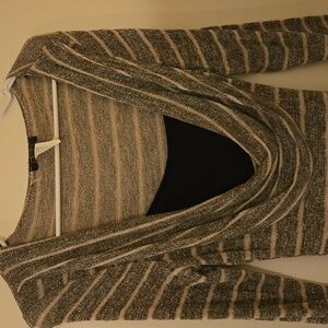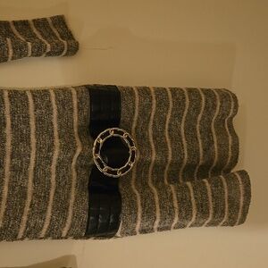 cute pink and gray sweater built-in waist belt detail. swoop neck. thin stretching material.