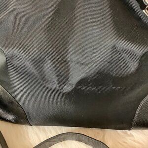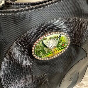 This is a black nylon and black lizard embossed Italian leather, silver tone chain, large crossbody or shoulder bag from Debbie Brooks New York. has a crystal embellished golf medallion. Removable crossbody strap. (Stored inside the bag.) Magnetic snap and zipper closures. Silver lining. Light rub wear on the bottom corners. Scuffs on nylon. Golf ball, golf tee, driver, golf club.