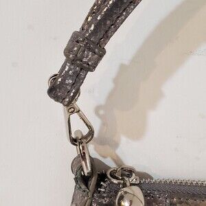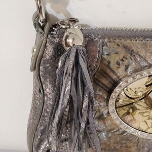 Very good used condition, no flaws or excess wear noted to the bag but it is missing 1 tiny jewel on the top of the floral art piece as shown. Stunning mix of leather patterns (butterfly wings and snake embossed). Lovely signed floral art piece with tiny jewels around the edge and in the design. Silver metallic sueded leather Tassel zipper pull Short straps with 5.5" drop (great for wrist/elbow carry and also tucks nicely under the shoulder) 8" wide x 5" tall