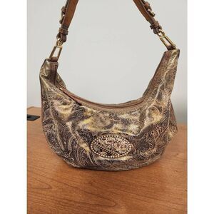 Debbie Brooks, as seen in Shark Tank, brown and gold Shimmer floral design with rose emblem with bling. Faux Crocodile Embossed sides, bottom and handle.