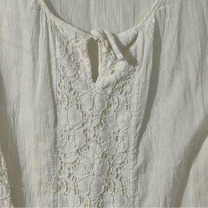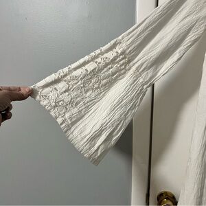 This chic Debbie Katz cover-up is a crisp white hue with crochet accents. Flowy cotton fabric and bell sleeves give a beachy bohemian vibe. Made in the United States, this swimwear cover-up is a must-have for your next tropical getaway.