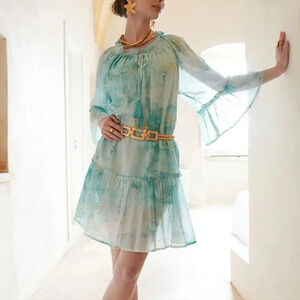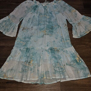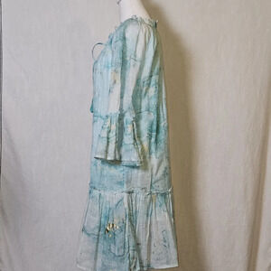 This Debbie Katz Nalai Tunic Aqua Metallic Block Print Midi Dress in size M features a cottagecore style with a colorblock pattern in shades of blue. The dress has 3/4 flutter sleeves with ruffle and tasseled accents, a round neckline with a keyhole detail, and a pullover closure. Made from a blend of lurex and cotton, this midi dress is perfect for weddings, parties, or casual occasions, and is designed with whimsical and colorful elements that evoke an artsy and bohemian vibe.