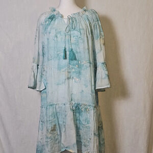 Debbie Katz Nalai Tunic Aqua Metallic Block Print Midi Dress Sz M Cottagecore