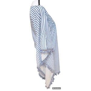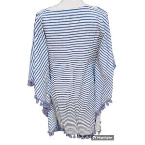Elevate your style with this beautiful Debbie Katz South Beach Kimono Oversized Top in size medium. The striped pattern, tasseled and embroidered accents, and V-neckline make it perfect for casual and travel occasions. The pullover closure and 3/4 kimono sleeves add to the relaxed fit and breathability of the top. Handmade in India from 100% cotton woven fabric, this top is suitable for all seasons and can be worn in summer, fall, and spring. The blue and white color combination adds a touch of bohemian and beachy vibe to your outfit. Garment care requires hand wash only. This top is a must-have for women who love the California style and want to add a touch of relaxed elegance to their wardrobe. CLOTHING AND FABRIC ITEMS: All clothing and fabric items have been steam cleaned and/or washed. Small pinhole near back tag.