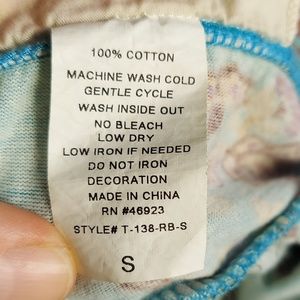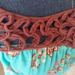Pretty teal blues, browns and oranges make up this tank with a bit of off white and purple. Cute, fun and flirty best describes this tunic. 100% cotton, it flows in the wind and is super comfortable. An embroidered, textured straps lay gently over the shoulders and can be adjusted for your personal preference. It has a great boho feel. Perfect for concerts, festivals or bumming around town.