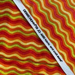 Debbie Mumm cotton fabric remnant designed for Joann’s Fabrics & Crafts Stores. This fabric is done in a bright orange, yellow, red & green wavy stripes print. Plenty for quilting or crafting - in good condition - clean & fresh