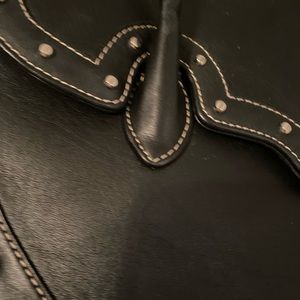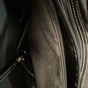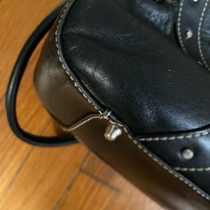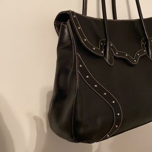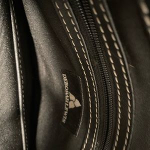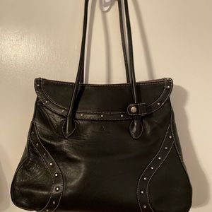 Deborah Lewis large handbag with silver metallic detail. Two zippered interior, 3 Open, and key ring attachment. 15.5 length, 5 width, 12 height. Excellent pre owned condition with immaculate interior.