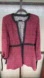Burgundy tweed with faux leather (Tweed: 55% Viscose, 23% Silk, 22% Cotton, Faux leather: 50% Polyurethane, 50% Polyester). Jacket. Long sleeves. Front hook-and-eye closure. Fully lined. 33" from center back to hemline. Imported.