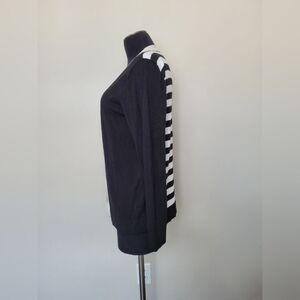 Classic and timeless cardigan sweater by Debra DeRoo. Super soft material, black and white contrast on front and stripes on back with mother of pearl buttons. Condition is excellent. Tagged size small measures approximately 26 inches long 18.5 inches underarm to underarm laid flat.