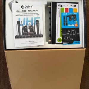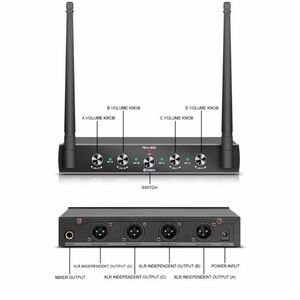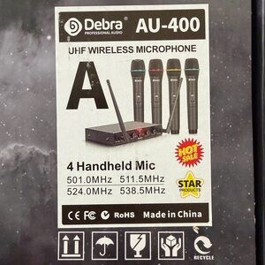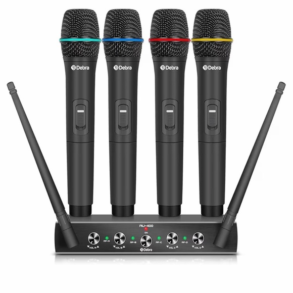 Enhance your audio setup with Debra's wireless microphones. Features four mics with color-coded bands for easy identification. Ideal for events and performances.