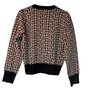 Debut Brown Black Geometric Cropped Sweater Crew Neck Long Sleeve Women M NWT