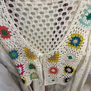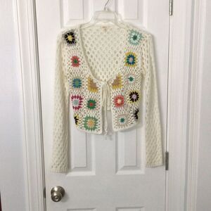 • Style: Crocheted cardigan with tie front, multicolor granny square design