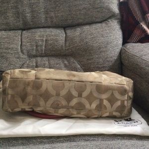 Beige signature satiny satchel with coral details. No rips or stains on outside. One partially washed-out pen stain on inside pocket. Purchased new in 2013, Dec 12 style. Minimal use, has been stored in dust bag since 2015. Zipper pulls, tags, and handles in excellent condition. Outside of purse would benefit from a wash, but no stains noted.