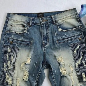 NWOT. Medium Wash Jean Shorts for Men Size 34. Zipper and button for closure, 4 front pockets (the bottom 2 pockets has zipper for closure, 2 back pockets, distressing, has loops, Bermuda, ridge design sides. Please note, there are no material/care tag. Pictures are part of description.