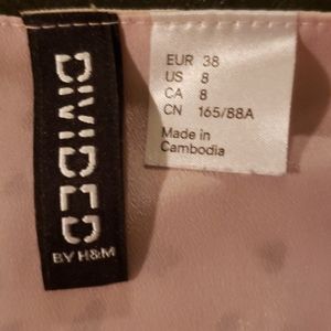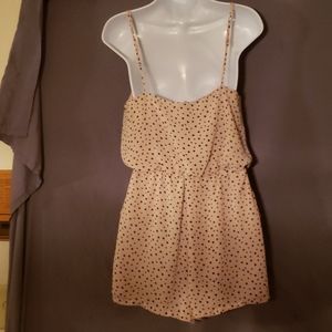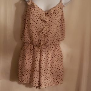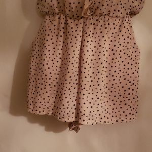 Light pink (blush color) romper with chocolate-colerd heart print. Has invisible pockets. Sized 8 but is a Medium size. Lightly worn.