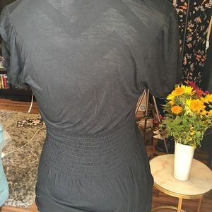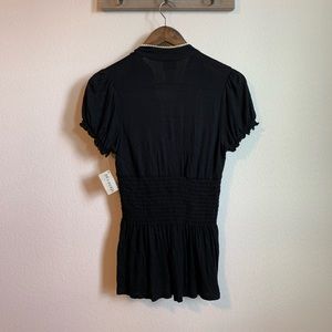 Feeling romantic yet??? This beautiful back top has a dreamy ruffle front, elastic at the end of the short sleeves. And elastic in the back part of the waist for a loose fit.