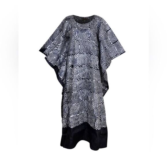 Gorgeous Declaj Clothing original design, hand sewn crew neckline pullover dolman maxi dress/gown/caftan in shades of black/gray circular tie-dye. matching scarf/head wrap/belt. Multiple sizes. Size chart in last photo Stitched sides with hidden armholes. Adire (Yoruba) textile is a type of dyed cloth made in south west Nigeria by Yoruba women, using a variety of resist-dyeing techniques. It is a material designed with wax-resist methods that produce patterned designs in dazzling arrays of tints and hues. It is common among the Egba people of Ogun State. Adire means tie & dye. New in original packaging. Nonsmoking home.