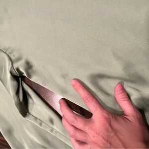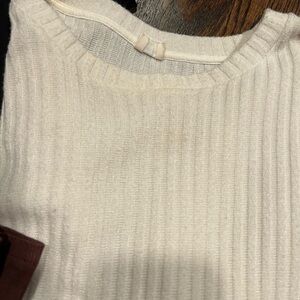Unbranded basics, worn white sweater (piling and slight discoloration), and deodorant marks