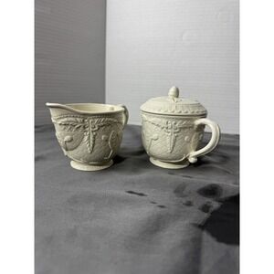 The Decma Cremeware II Creamer and Sugar set is a vintage porcelain set from 1989 in an off-white color. The French Country style creamer and sugar bowl are part of the Decma brand's original Cremeware II collection, designed for all occasions. This set is a charming addition to any kitchen or dining area, embodying a classic and timeless aesthetic with a touch of elegance.