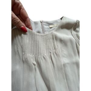 Elegant DECO beige silk blend dress made in Korea. Features a luxe silk skirt with a soft sheen and a lightweight, crepe-like bodice—lined for coverage and comfort. Delicate pintuck pleats add structure to the top, while a pleated belt with a crystal and pearl bow detail cinches the waist beautifully. Size is not displayed so see pictures for measurements. Hidden back zip, short puff sleeves with button accents, and pleated hem for a timeless finish. Perfect for weddings, showers, or formal events.