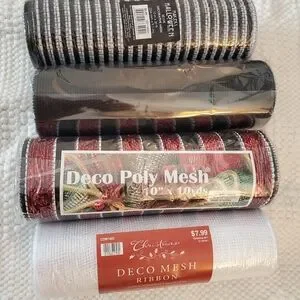 Set of four Deco Poly Mesh ribbons. Includes black, red, and white colors. Perfect for crafting and decoration.