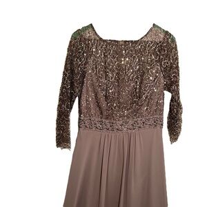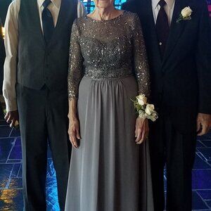 Great condition. Decode 1.8. Formal Dress. Lace Illusion Neckline. Boatneck. 3/4 Sleeve. Sequin Lace Top. Darker gray color. Zips up back. Style 182734. Size 4. 100% polyester. Measurements available upon request. Smoke free home. No trades, offers welcome.
