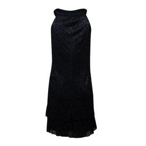 Dress features full lining, embellished scoop neck, sleeveless, metallic pleated layered fabric, shift silhouette, and pullover style.