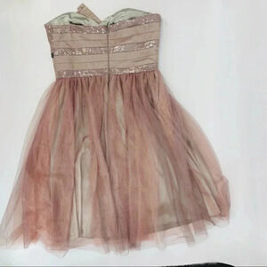 Grey underskirt and a layer of pink and a layer of dusky purple netting come together to create the most beautiful mauve effect. Beading on the strapless bodice. Excellent condition. Perfect for prom, homecoming or an evening wedding guest dress.