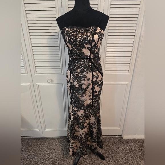 A stunning strapless gown featuring a tan base color with intricate black floral patterns, floor-length silhouette, and a fitted bodice. approximate measurements in pictures. small pull on embroidery is pictured but not noticeable. Offers welcome