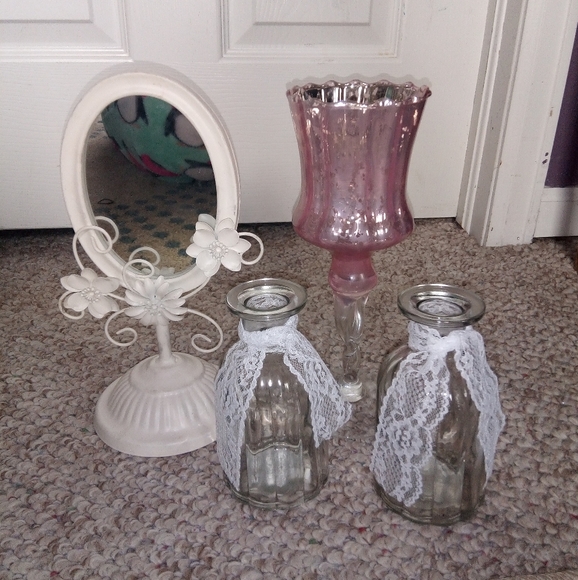 Faux vintage mirror, candle holder, 2 incent holders/vases with lace accent