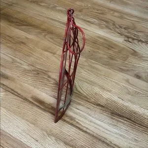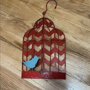 Rustic Red bird cage with blue bird. Hangs flat against the wall.