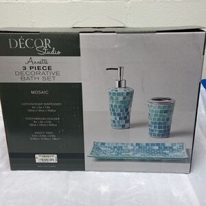 Bring some stylish shine to any bath with the sparkling mosaic glass design of these Annette bath accessories from Décor Studio. Set includes a vanity tray, toothbrush holder and lotion pump. Makes a great gift!