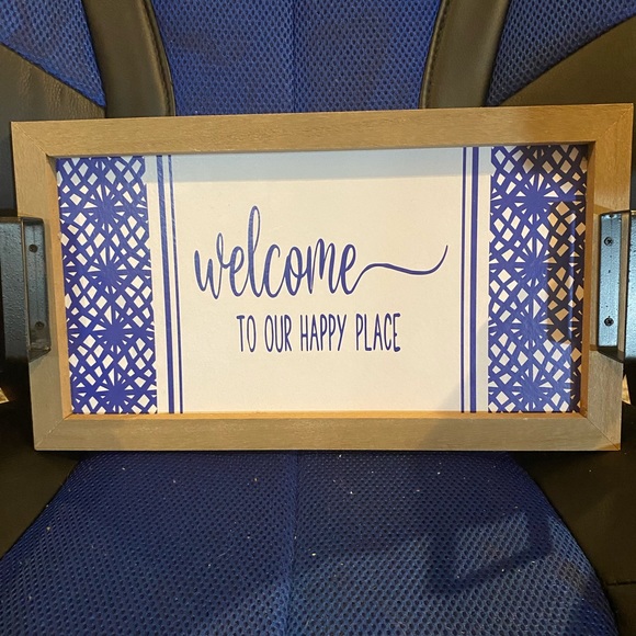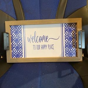Mid size decor tray. Off white background with a sapphire blue design and writing. New condition.