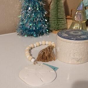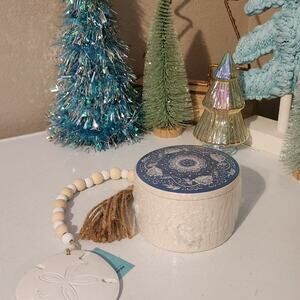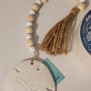 Decor perfect for the summer, a small natural garland with white and wood toned beads with a large ceramic sand dollar. Also included is a small ceramic dish with beautiful blue decorated lid. Great for any bathroom, counter top or mantel.