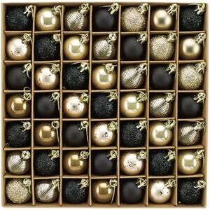 Includes 49 small baubles in black, gold, and glitter finishes.