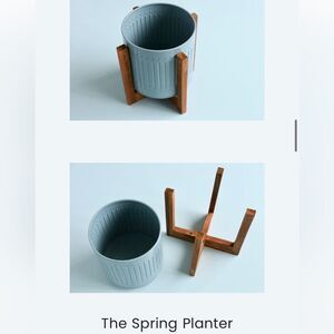 1 - Blue Metal Planter with Wood Stand