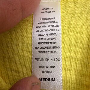 This stylish 3/4 sleeve top by Decorated Originals features a vibrant yellow fabric complemented by rhinestone-embedded daisies. Made from soft, breathable cotton and polyester, its relaxed fit ensures comfortable wear. A notch neckline adds flair to this versatile design. Size Medium.